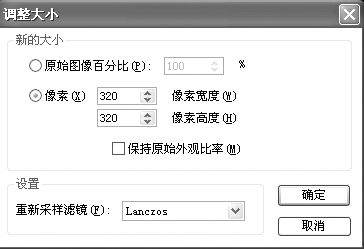 2.点工具栏中的“调整大小”按钮,在弹出的对话框中去掉“保持原始外观比率”前面的“√”,设置像素为:“320×320”,最后点“确定”结束(图3)。