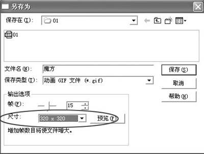 4.点“下一步”,在左边的功能区出现“动画GIF文件”和“输出到网页”两个选项。其中“输出到网页”是将动画输出到网页(HTML)文件,这里我们选择“动画GIF文件”文件,生成动画。点“动画GIF文件”,在弹出的对话框中选取保存路径并取一个文件名,将下面的输出选项设置为帧:“15帧”(最多为3帧),尺寸为:“320×320”(最大设置)(图8)。