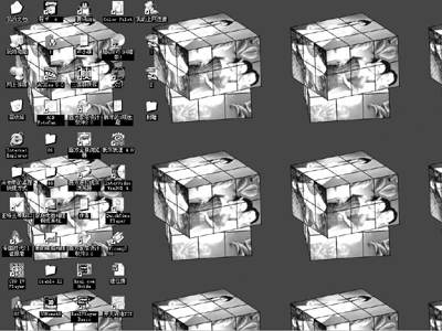 关闭《我形我速》,点桌面上的“我的电脑”,在电脑中找到刚才做成的“魔方”,选取它,按鼠标右键,在弹出的菜单中选“设置为桌面背景”,回到桌面,现在你看桌面是不是已经生成动态的魔方了(图9)?有意思吧!,现在你可以在你MM面前炫耀一番了。呵呵,赶快动手也做一个吧!