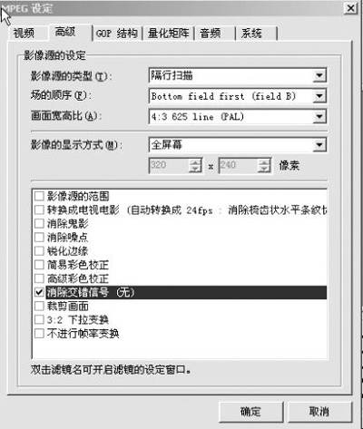 6.在“码率控制模式”项中选择“固定码率(CBR)”,点中右边“设定”,将码率设为4000kbits/sec,按下确定。再进入“高级”项,选中“消除交错信号(无)”(图5)。选中该项目的是去除交错选项,以避免压缩的MPEG-2文件存在交错横纹。