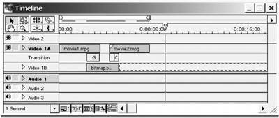 4.拖放Cross Dissolve转场效果到Transition轨道上,并和位图文件的尾部对齐,调整持续时间,最后将视频文件movie2.mpg拖放到Video1A轨道上,前端和Cross Dissolve转场效果对齐就可以预览了(见图)。