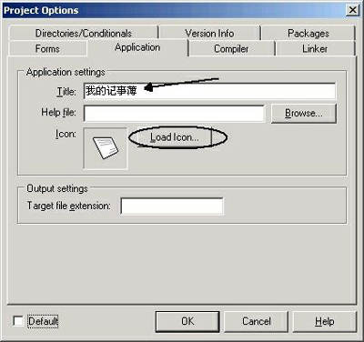 ①执行主菜单“Project/Options…”命令,打开“Project Options”对话框,选择“Application”选项卡,设置程序名称“Title”为“我的记事簿”,并为程序指定一个“Icon”作为你的程序图图标(图1);