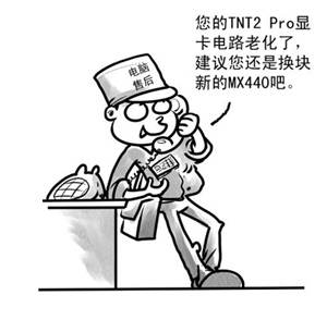 第二天,打个电话给客户,一番客套后,告诉客户显卡电路老化了,这样虽然可以用,但是极不稳定。待客户听明白后,我建议道:“您不如买块最新的MX440SE吧。”客户一听要出血,当时就急了,开始和我争。我耐心地跟他解释道理。末了,客户带钱过来,拿走了新的MX440,那块丽台的TNT2 Pro,大出血的客户反倒忘了拿。