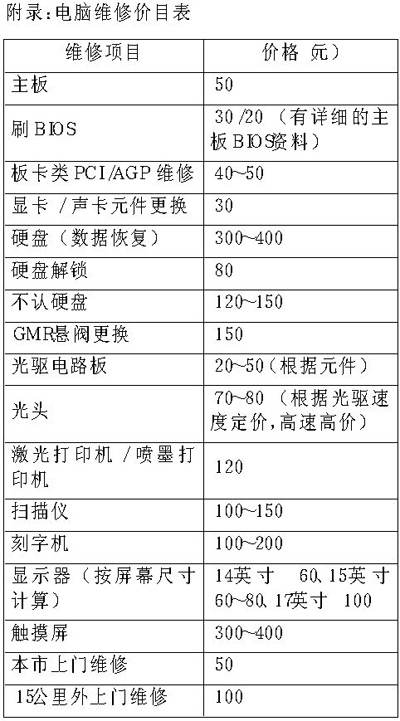 附录是我收集的一些比较常见的电脑故障的价格表,可以给大家在实际维修时作为参考。