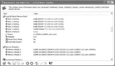 打开Sisoftware Sandra中的“Mainboard Information”(主板信息)项目,然后拖动右侧的滚动条找到“Logical/Chipset Memory Banks”和“Memory Module(s)”两个项目,如图2所示。由于笔者使用了Kingmax 128MB PC150内存,因此这里便显示为“128MB 16X(8MBX8)SDRAM PC133U-333-542(CL3 upto 133MHz)(CL2 upto 100MHz)”,其中“PC133U-333-542”是PC133内存的统一标注格式。如果你使用的是DDR内存,也可以查看到相应的信息。