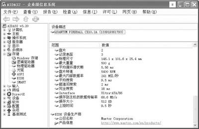 在AIDA32主界面的左侧窗口中找到“存储/EIDE”项,在右侧窗口就会显示所有EIDE设备相应信息(如图3所示)。
