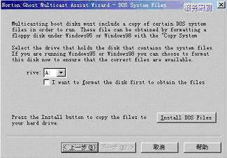 2.从软盘拷贝DOS启动文件到Norton Ghost\template\common目录(如图1),选中“I want to format the disk to obtain the files”,然后单击“Install DOS Files”,等到Windows 的“格式化”窗口出现,选中“复制文件系统”,格式化软盘后关闭“格式化窗口”,你的DOS启动文件已经拷贝完毕,单击“下一步”。