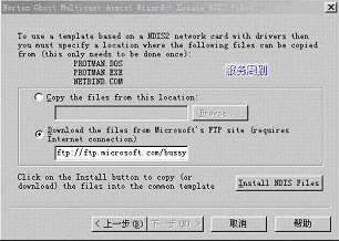 4.拷贝NDIS2网卡的驱动程序,你需要指定包含有Protman.DOS、Protman.exe、Netbind.com等文件的目录。如果你没有这些文件,可以选中“Download the files Microsoft’s FTP site (requires internet connection)”,然后单击“Insatall NDIS Files”来安装(如图2)。文件会被自动拷贝到template文件夹的某子文件夹下(文件夹的名字是你所起的)。