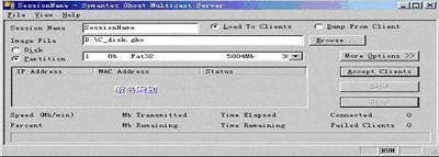 运行Ghostsrv.exe程序,就是Multicast Server的主界面窗口(如图3),在“Session Name”中为你的服务器命名(这里是SessionName),在Image框中输入你的镜像文件的路径和文件名(这里是D:\C_disk.gho),因为我们是从文件中还原分区,所以在“Partition”中选择将要恢复到的分区,按下“Accept Clients”等待客户端的连接。