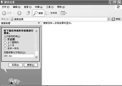 目前,主流计算机配制的硬盘都是几十GB的大容量,里面的文件个数将会多不胜数。而初学者在使用了电脑一段时间后往往找不到自己要用的文件,但是只要你还记得此文件的蛛丝马迹,这时使用Windows的搜索工具便可以快捷、高效地搜索到文件、文件夹,甚至可以搜索到网络上某台特定的计算机。下面我们以寻找“ABC.doc”为例来讲解Windows XP文件搜索工具的使用:
