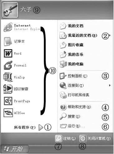 在WindowsXP中,点击“开始”,就弹出了“开始”菜单。下面按图号一一道来。