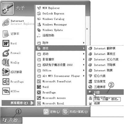 使用“开始菜单”启动程序的方法很简单。例如我们要玩扫雷游戏,那么应进行如下操作:①先用鼠标单击“开始”按钮,打开“开始菜单”。②将鼠标指向“所有程序”。③从弹出菜单中选择“游戏”。④在它的子菜单中用左键单击“扫雷”,即可进入《扫雷》游戏的界面了。