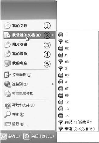“开始菜单”的右上部分包含了①“我的文档”、②“我最近的文档”、③“图片收藏”、④“我的音乐”、⑤“我的电脑”5个选项。其中最值得一提的是“我最近的文档”项,它里面保存了最近访问过的文档和文件,方便我们再次调用它们。此项中最多能够显示15个文件。另外,点击其他几项均可以打开对应的文件夹或操作窗口。