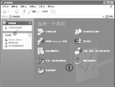 区域①中的每一项都对应着一个调整工具。如果你习惯使用Windows 98样式的控制面板,那么点击②即可切换。