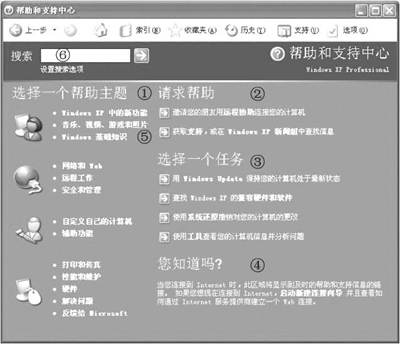 在该中心的主页上,有①“选择一个帮助主题”、②“请求帮助”、③“选择一个任务”和④“您知道吗?”4项内容。假如我们要学习Windows的基本知识,那么只要选择“选择一个帮助主题”下面的⑤“Windows 基础知识”项,就可以进入基础知识的学习界面啦。
