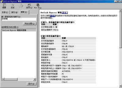 在OE的运行主界面上单击“帮助”菜单中的“目录和索引”命令,打开OE的帮助窗口。在左边的窗口中选择“搜索”标签项,然后在“键入要查找的关键字”框内输入“快捷键”。按下回车键或者单击“列出主题”按钮,接下来系统就会把包含“快捷键”的主题都列出来。最后双击有关快捷键的主题项,在右边的窗口就会显示出该软件的所有快捷键了(如图)。
