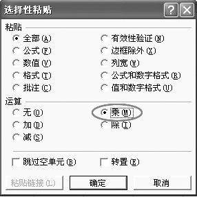 上面的方法只有在Excel 2002才有效,若你用的是Excel 97/2000就没那么幸运了。下面介绍一种通用的方法,也是非常方便的。在工作表的任一空白单元格中输入数字1(保证此单元格格式是“常规”格式),选中单元格,单击工具栏上的“复制”按钮,选取需要转换的单元格区域,在“编辑”菜单中单击“选择性粘贴”,打开“选择性粘贴”对话框,在“运算”下选择“乘”(图2),