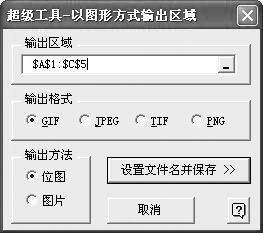 若想在一些没有安装Excel的计算机中查看Excel表格数据,这在以前几乎是不可能的,但借助“超级工具”的帮助,我们可以把表格中的数据转换为GIF、BMP之类的图像文件,这样只要使用图像浏览软件就能够查看数据了。在将Excel表格数据转换为图像文件之前,用鼠标圈选那些需要输出的表格区域,接着运行“超级工具→工作表工具→以图形方式输出区域”命令,并且在图2所示窗口中选择输出的图像格式,最后按下“设置文件名并保存”按钮即可。