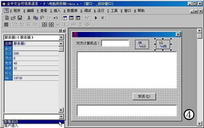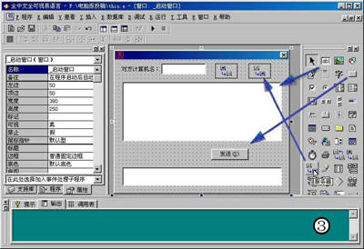第一步:首先运行《易语言》(可以在http://www.eyuyan.com下载),新建一个程序。在窗口中放置一个标签控件 ,标题属性改为“对方计算机名:”;放置一编辑框1控件 ,大约占一行;在下面放置一大一些的编辑框2控件 ,这是用来放回复的内容的地方;接下来放置一个按钮1控件 ,改标题为“发送”;最下方再放一个大一些的编辑框3控件 ,这是用来存放发送过来的内容的。最后,在任意处放一个服务器1控件和一个客户1控件 。如果服务器控件与客户控件不好区分,可以将鼠标放在控件上面两秒钟,就会在鼠标下方有一行提示框出现。如图3所示。