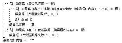 提示:其中,如果真是一个判断语句,大家可以看到,由它产生了流程图,以方便用户的调试,而转换为IP地址是一个命令,可以将编辑框1中的内容转换为对应的IP地址(如192.168.0.2),最后一行的语句是表示发送完成后,清空发送的区域文字。