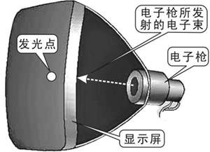 电子枪发射的电子束最后会打到涂有一层荧光涂料的显示屏上(也就是显示器最前面的那块玻璃),因为这种荧光涂料比较特殊,当电子打在它的身上时,被电子打中的这个点就会发光(图2)。