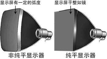 所谓纯平显示器,是指显像管的表面无论在水平方向上,还是垂直方向上都没有任何弧度存在,屏幕的外表面从边缘到中央都水平如镜。使用这种显像管的显示器就叫做纯平显示器(图4)。