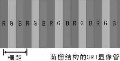 而对于荫栅结构的CRT显示器而言,因为没有所谓的光点(只有光带),所以对于这类显像管而言,所谓的“点距”就应该是“栅距”了──两条同色色带间的水平距离(图7)。