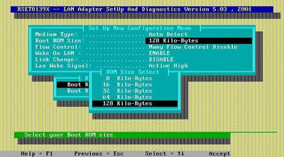 如果用1Mb的芯片来写保护模块,请在执行8139网卡设置程序rset8139.exe时按空格键进入设置界面,选View Current Configuration查看网卡Boot ROM容量,选Setup New Configuration,回车后选Boot ROM Size将其启动容量设为128KB,512Kb的芯片相应在网卡中设为64KB(图3)。