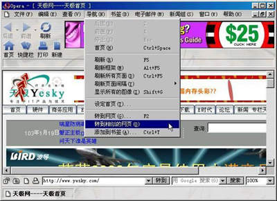 我在打开天极网的首页后,本想调用“写字板”程序(Opera中默认用“写字板”查看源代码),便点击菜单栏中的“查看”,一不小心却点到了“导航”。在展开的下拉菜单中,我看到了从未使用过的“转到相似的网页”按钮(如图),不禁好奇,便顺手按下。出现了什么?Google!我压制住心中的激动,仔细查看这个页面,发现这里列出了25个网站,都和天极网一样属于大型IT网站。我又试着用几个不同类型的网站做实验,都能得到一些与之类似的网站。