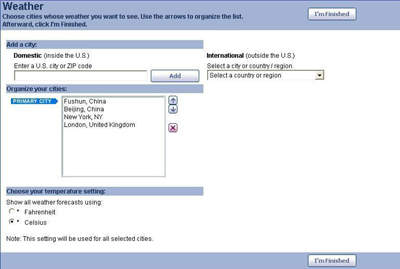 我们在位于网页右半部分的“Select a country or region”下拉菜单中选择“China”,注意:这时会在其下方新出现了“Select a city”下拉菜单,赶快看看有没有自己所在的城市吧!其实这里面列出的城市还真不少,我想一定有你所在的城市。选择好城市后,单击右边的“Add”按钮,这时你选择的城市就出现在了“Primary City”方框中了。此时不要着急选择“I'm Finished”按钮,还有两件重要的事要完成: