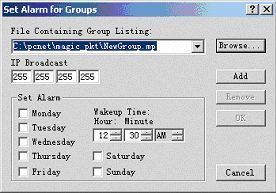 前面还提到了群组定时唤醒功能,这个功能的使用方法也非常简单。不知大家是否注意到主界面的按钮中有一个像时钟一样的图标。按下这个按钮就会弹出定时唤醒的对话框(如图6)。这时利用“Browse”(浏览)找到刚才保存的列表文件,然后再设置星期几、几点钟执行,最后“OK”即可。