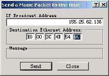 点击它后会出现一个如图7的对话框。在对话框的IP Broadcast Address(IP广播地址)一栏中填入目标计算机的IP地址,然后在Destination Ethernet Address一栏的空格中填入目标计算机的网卡物理地址,最后按下“Send”(发送)键即可完成对单机进行网络唤醒的动作。这样够简单吧!