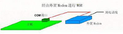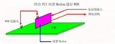 对于内置Modem,同样需要像网卡那样在Modem与主板之间连上一条WOM(R)功能线(如图9),其他部分的连接则与外置Modem相同。