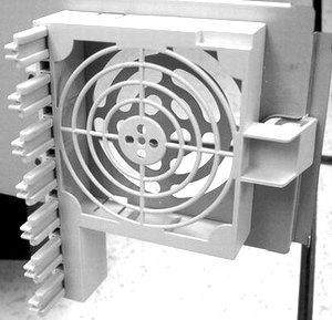 整个塑料模块覆盖在CPU和内存区域的上方,从箱体前部吸入空气,然后让气流吹过散热片,最后热空气通过箱体侧面的气孔排出,这样就为CPU单独配备了一个散热系统,从而使服务器的整个散热系统性能提高很多。
