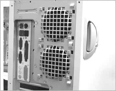 为了达到散热的效果,服务器机箱除了要安装多个风扇外,机箱内的散热系统也是非同寻常的。一般情况下在服务器机箱背面有两个风扇位(图2),
