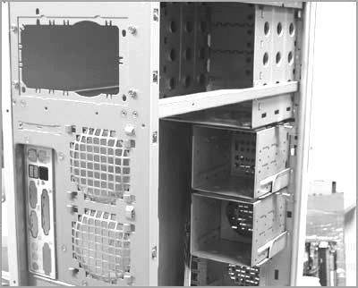 它的机箱上方是可以同时安装4个5英寸设备的扩展架,它的下方有两个3英寸扩展架,每个扩展架上可以安装3个3英寸设备,也就是总共可以安装6个3英寸设备!