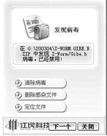 不去管它了,笔者这时才想起还没打开自己的KV2003杀毒王进行实时监控,于是笔者打开KV2003杀毒王进行实时监控,然后准备上网。KV2003杀毒王已经5天没升级了,还是先升一下级吧。点击“智能升级”,不到两分钟,升级完毕。这时,杀毒软件突然提示:“发现病毒I-Worm/Gibe.b,已被禁用!”(见图)。