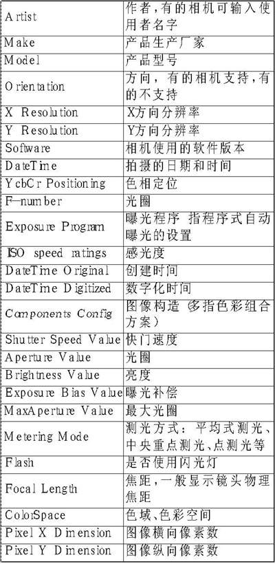 Exif V2.2在V2.1版的基础上增加了有助于提高打印数码照片质量的信息(简称tags),主要包含拍摄条件信息和处理信息: