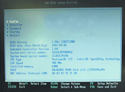 1.开机进入BIOS,在里面看到本机真实的内存容量和硬盘容量(如图)。同时必须注意只有在BIOS、主机底部和包装箱上的序列号完全相同的时候才说明这台笔记本电脑是原装的。看中机器先不要急于购买,应当把当前机器的型号和你先前上网查看的对应型号进行比较,不一致的话不能买。