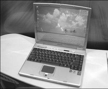 三星迅驰笔记本电脑的型号为X10(图1),尺寸为315.5mm×259mm×23.9mm,重1.8kg,采用Pentium-M 1.6GHz处理器,256MB DDR266内存和40GB硬盘,显卡为GeForce4 MX Go,32MB独立显存。X10内置了超薄的COMBO光驱(9.5mm厚),显示器为14.1英寸LCD,网络功能方面非常强大,带有Modem、10/100Mbps网卡和802.11b无线网络功能。同时,它拥有IEEE1394,USB2.0以及记忆棒接口,售价约为19800元。