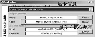 最稳妥的方法是借助专业的显卡测试软件(产品说明书都不一定靠得住),例如NVIDIA显卡的工具软件RivaTuner,或者是通用显卡工具PowerStrip,它们能够告诉你显卡的详细参数(这两款软件都可以在驱动之家http://www.mydrivers.com下载到)。