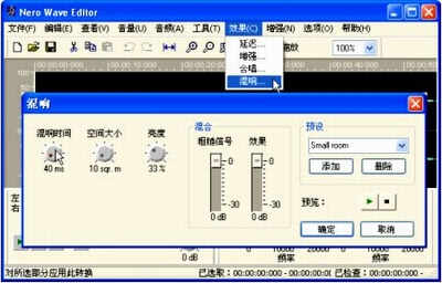 Nero Wave Editor可以对声音文件进行编辑和效果处理。我对采集的声音只进行了混响处理:选择“小房间”模式,然后将“混响时间”和“空间大小”值尽可能调小,这样处理后的声音要纯净一些(图8)。