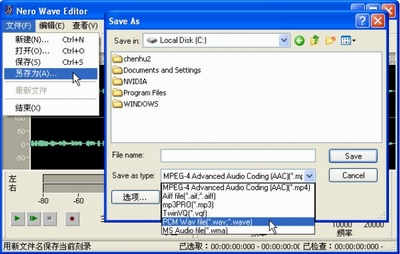 声音处理完毕,进行存盘。Nero Wave Editor可将声音文件存为多种格式,当然最常用的还是MP3格式和WAV格式。因为还要刻录CD,所以文件要存为WAV格式,避免音频压缩带来的音质损失(图9)。