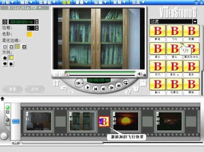 第二步:添加飞行效果。在“效果素材库”中单击“祝效果文件夹”中的下拉列表上的箭头来选择“过滤”,在下方显示的是一个效果画廊,选择“飞行”效果,将画面拖到要变化的两个视频之间(图1)。