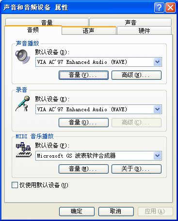 2.在“控制面板”中,单击“声音、语音和音频设备”,再单击“声音和音频设备”,然后单击“音频”选项卡(图1)。