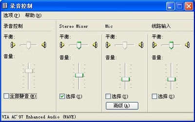 在线路下拉框中可选择其他捕获设备和输入线路。当选择“Stereo Mixer”时,可截取混音器中的声音(在线歌曲、在线电影、Flash等可由音箱发出的声音均可截取)。当选择“Mic”时,可通过麦克风录制声音。当选择“线路输入”时,可录制从计算机的“Line In”孔输入的音频信号(CD机、磁带机、收音机等机外音源的音频信号可通过音频线从此录入)。这里只能更改设备和线路,至于录音时音量大小的调节要到“录音控制”面板(图2)中去调节。