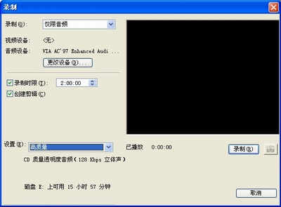 运行 Movie Maker 软件,在“文件”菜单上,单击“录制”按钮。弹出“录制”对话框(图3),看到“录制”按钮了吗?好了,先不要急着按它,我们还要再简单地设置一下,单击“设置”下拉框设置好要录制声音的质量,在“录制时限”对话框内还可以设置录制时间的长短,根据你的需要选择即可。