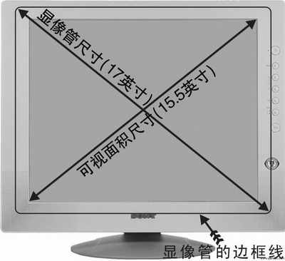 那什么又是“可视面积”呢?可视面积指的是用户真正可以看到的尺寸。为什么会这样呢?显示器都有一个外壳的,为了固定显像管,外壳就不可避免的会遮住部分显示屏(显示屏的四周),而这些被遮住的部分是不能用来显示图像的。因此,一台显示器的可视面积绝对会小于它标称的尺寸,比如大部分17英寸的CRT显示器的可视面积尺寸只有15.6~16.2英寸(图3)。