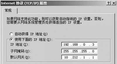 在Windows 2000网络中,可以将一台Windows 2000 Server 服务器设置为路由器。在进行路由设置时,要经过两步:先启用路由功能,而后配置静态或动态路由。如果两个VLAN之间要进行通信,只须把VLAN1中各计算机的网关设置为10.212.1.1,把VLAN2中各计算机的网关设置为192.168.0.1即可,图4为VLAN1中的计算机PC3所设置的网关。