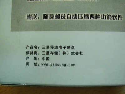 外观上明确标注的供货商″三星存储(株)式会社″根本就不存在,产地只是写明为中国,这就相当于没有中文的厂名厂址(与朗科的产品外包装一经对照即可清楚),盒上标注的网址http://www.samsung.com根本就是英文网站,要查到这一产品绝对不可能。打开包装盒,没有质保卡、也找不到相关的服务电话。